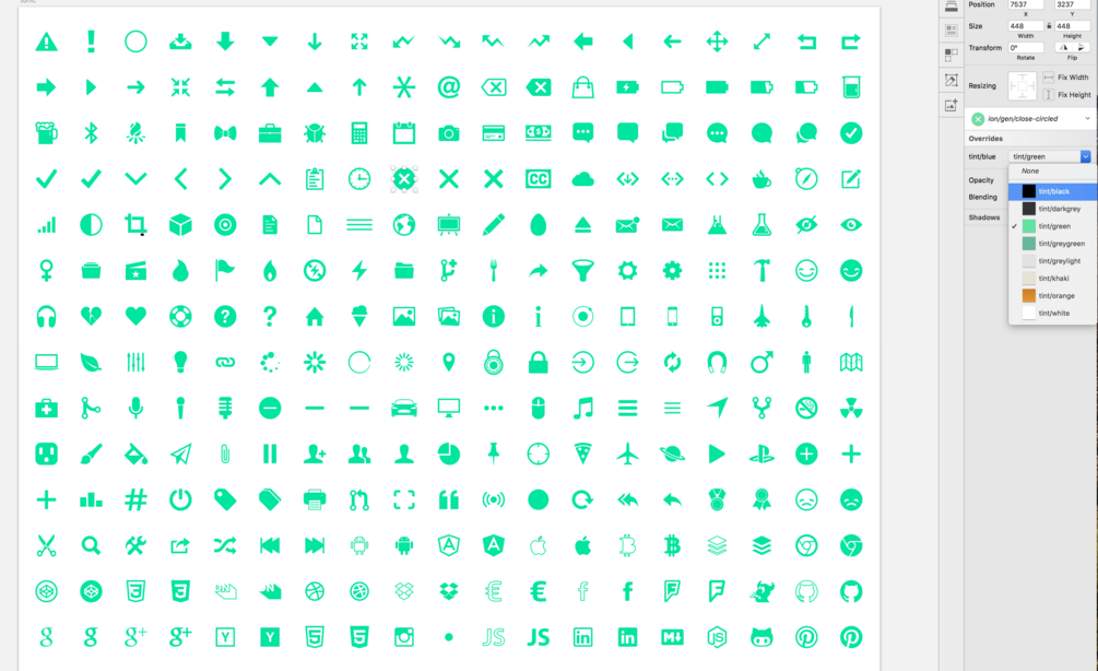 Fully vector IonIcons and Font Awesome icons built in Sketch. These have been built at 500px X 500px and have utilized nested symbols so that you can simply select a color from the drop down and away you go.